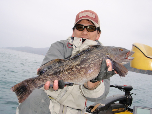 なかなかいい話の聞こえてこない最近のロック。今シーズンはいいバイトなんて・・・あったか?といった具合です。自他共に認めるバイトマニアARAさんとの釣行では魚を見つけるまで時間がかかってしまい、改めて自分の引出しの少なさを痛感しました。波の静かなシャローを延々撃ち続けては「カンッ!」というバイトを期待しますが現実は・・・。どうしようかエレキを踏みながらつい遠くを見つめてしまいます。帰り際、うねりの強く当たっているエリアで水深もちょっと深めの7~8mをさらっと。と数投目でARAさんにグッドサイズがヒット!